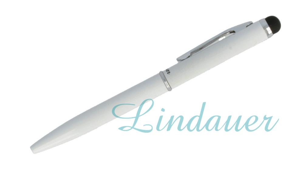Mini-Kugelschreiber in weiß mit gummiertem Top für Touchscreen-Displays wie Smartphones oder Tablets